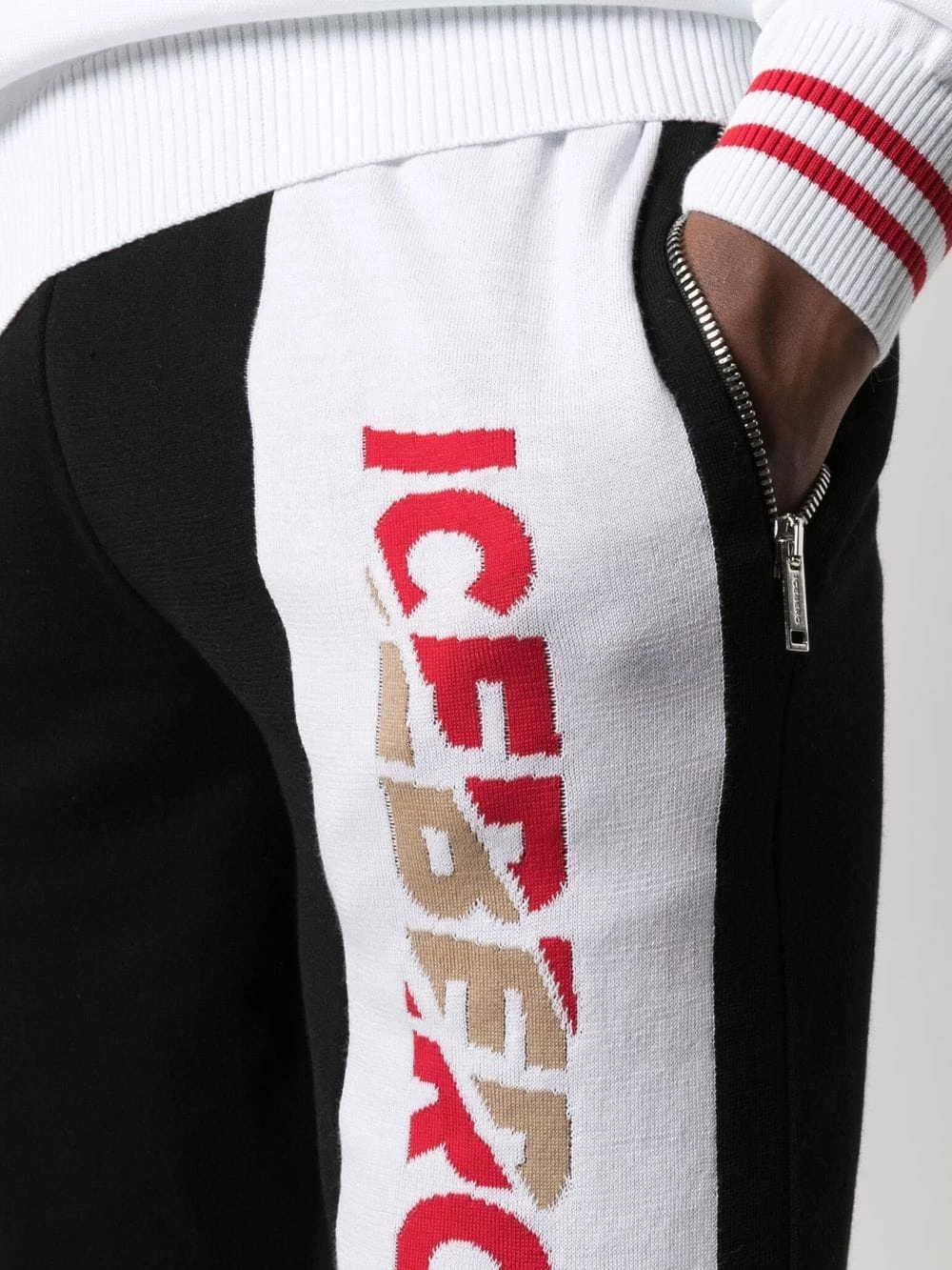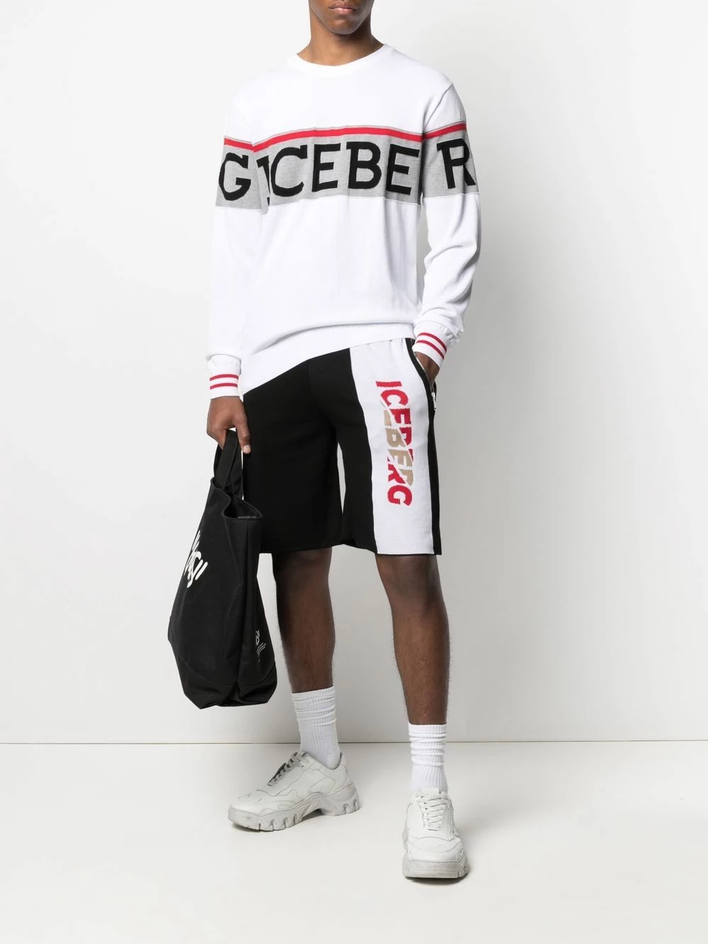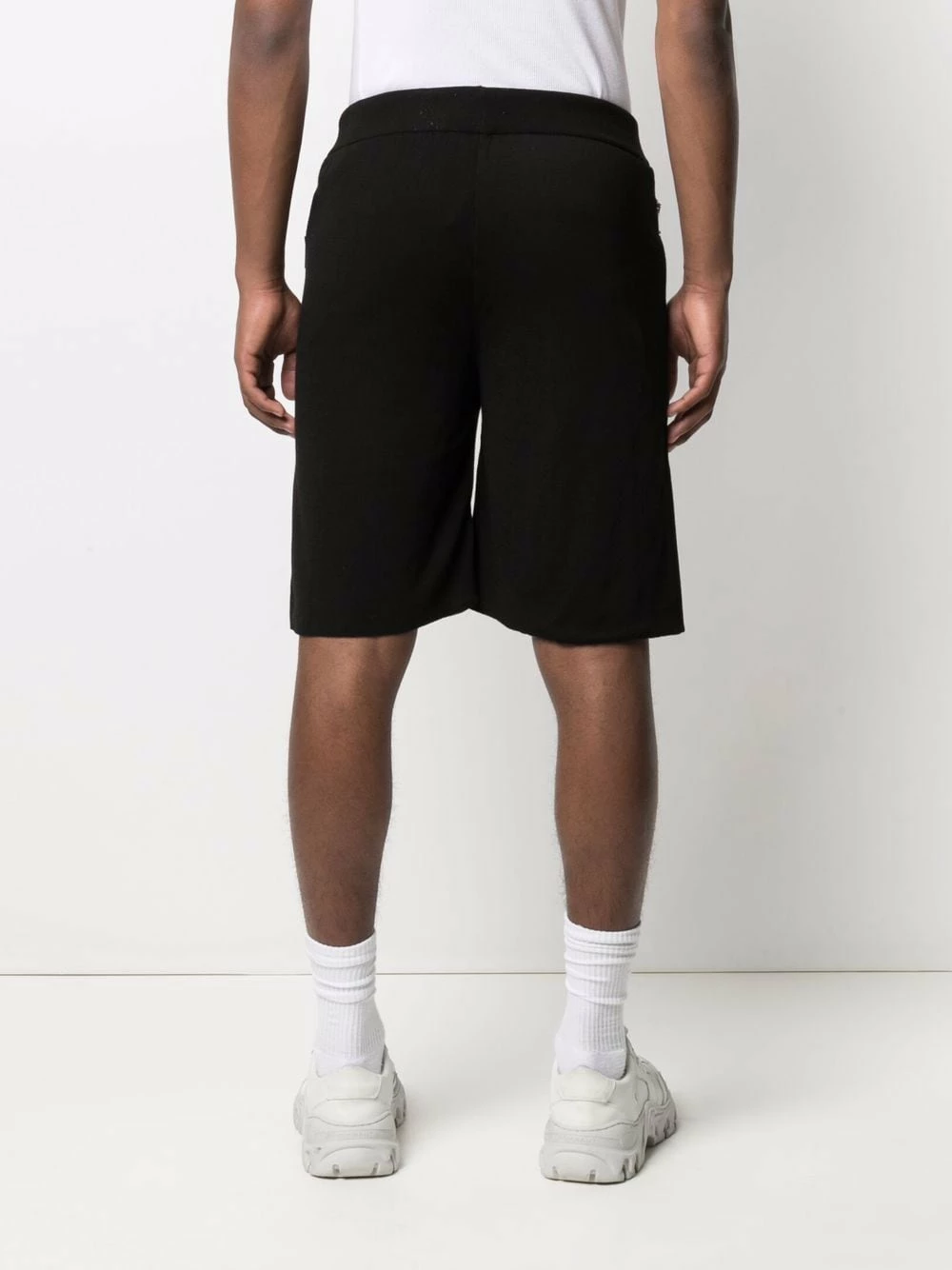 Logo intarsia, taille élastique à lien de resserrage, deux poches latérales zippées, hauteur genou. Matière : coton mélangé.