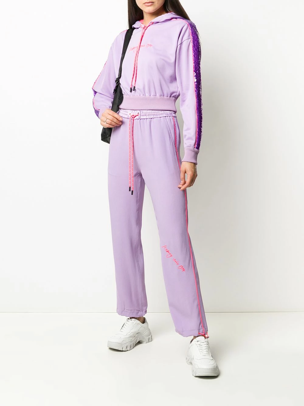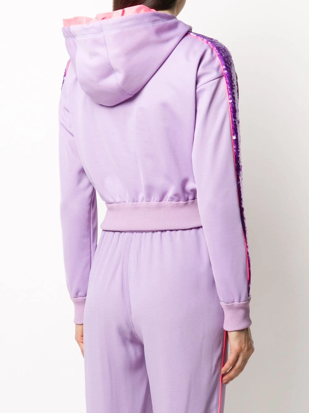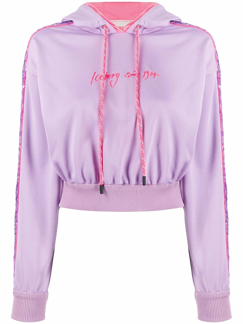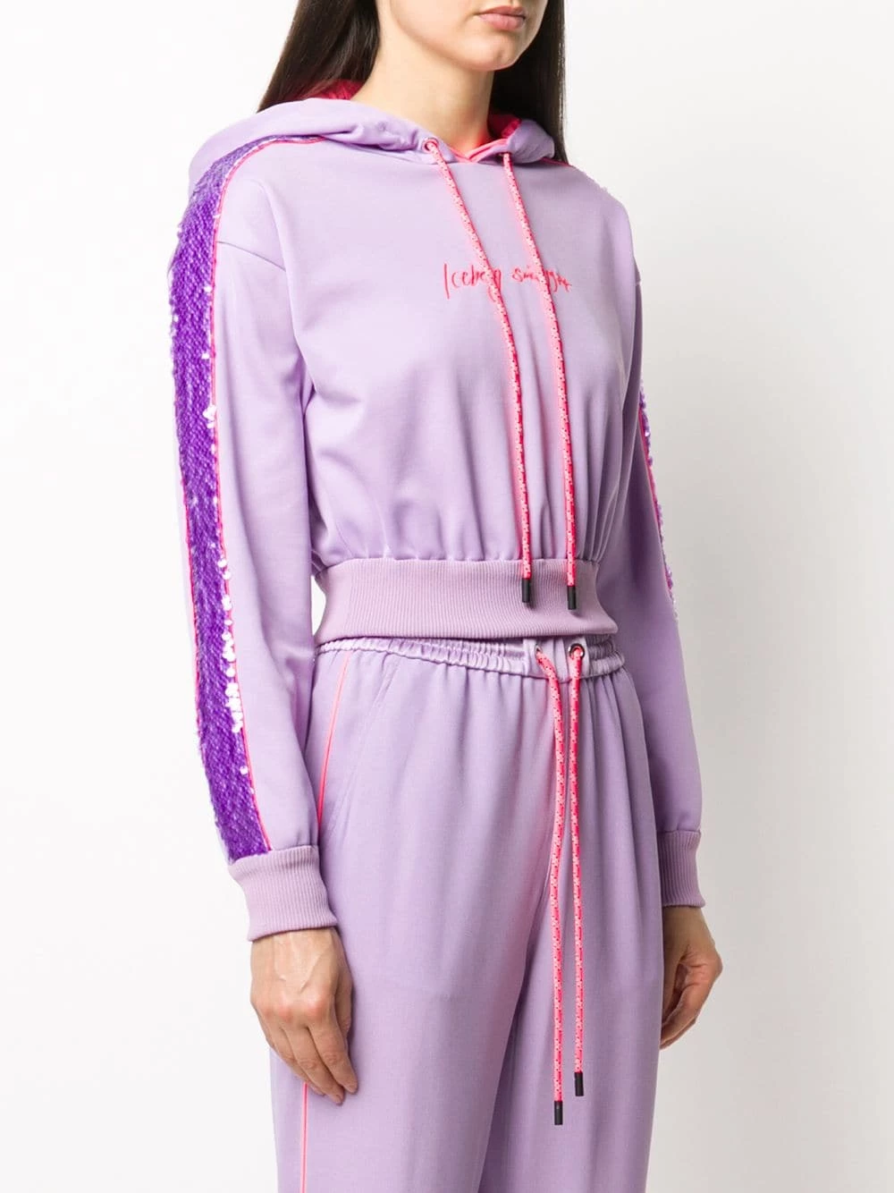 Sweat à capuche crop à lien de resserrage Iceberg avec logo brodé sur le devant, broderie de sequins, longueur crop, capuche à lien de resserrage, manches longues et ourlet et poignets nervurés. Couleur : violet.