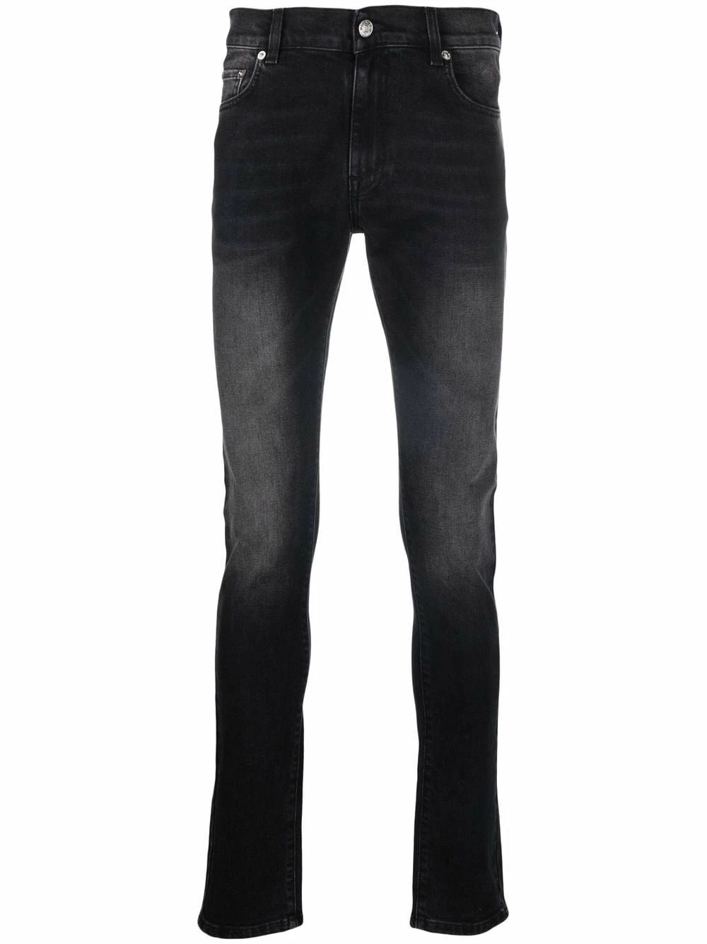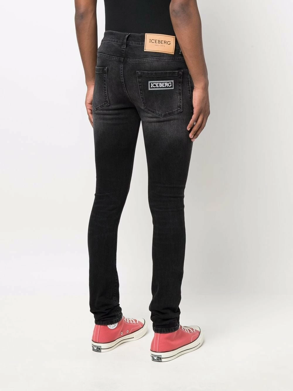 Black stretch-cotton denim logo patch skinny jeans from ICEBERG featuring faded effect, mid-rise, belt loops, front button and zip fastening and classic five pockets.
